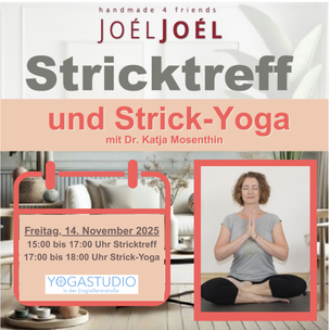 Von 15 bis 17 Uhr nehmen wir uns Zeit fürs Stricken, fürs Miteinander und für unsere Projekte. Im Anschluss daran (17 bis ca. 18 Uhr) lädt uns Dr. Katja Mosenthin zu einer wohltuenden Strick-Yoga-Stunde ein, speziell entwickelt, um die typischen Verspannungen von Strickerinnen gezielt zu lösen. Wir mobilisieren die Wirbelsäule, dehnen Finger, Hände, Handgelenke, Arme und den Schulter-Nacken-Bereich, damit du wieder ganz entspannt weiterstricken kannst. Zum Abschluss erwartet dich eine sanfte Entspannungsübung, die dich in deine Mitte bringt und den Tag harmonisch ausklingen lässt.