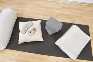 Jeder Körper ist anders und alle können Yoga praktizieren. Wir üben mit Blöcken, Gurten, Platten, Decken, Sandsäckchen und Stühlen.